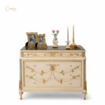 حوّل غرفة نومك إلى ملاذ من الرفاهية والأناقة مع غرفة النوم الكلاسيكي المستوحى من فنون العصر الذهبي. يبرز السرير بظهره العالي المنجد المريح المصنوع من الخشب الزان الطبيعي المحفور يدويا ببراعة مذهلة المدهون بدرجة الأوف وايت المطعم بالذهب المعتق، وتتكون هذه الغرفة من سرير و (2) كوميدينو وتسريحة بالمرايا بالاضافة الي الكرسي مع وحدة ادراج .