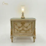 غرفة نوم “رينيسانس” ملكي – سرير فاخر مع طاولات جانبية (كمودينو) بنقوش ذهبية.