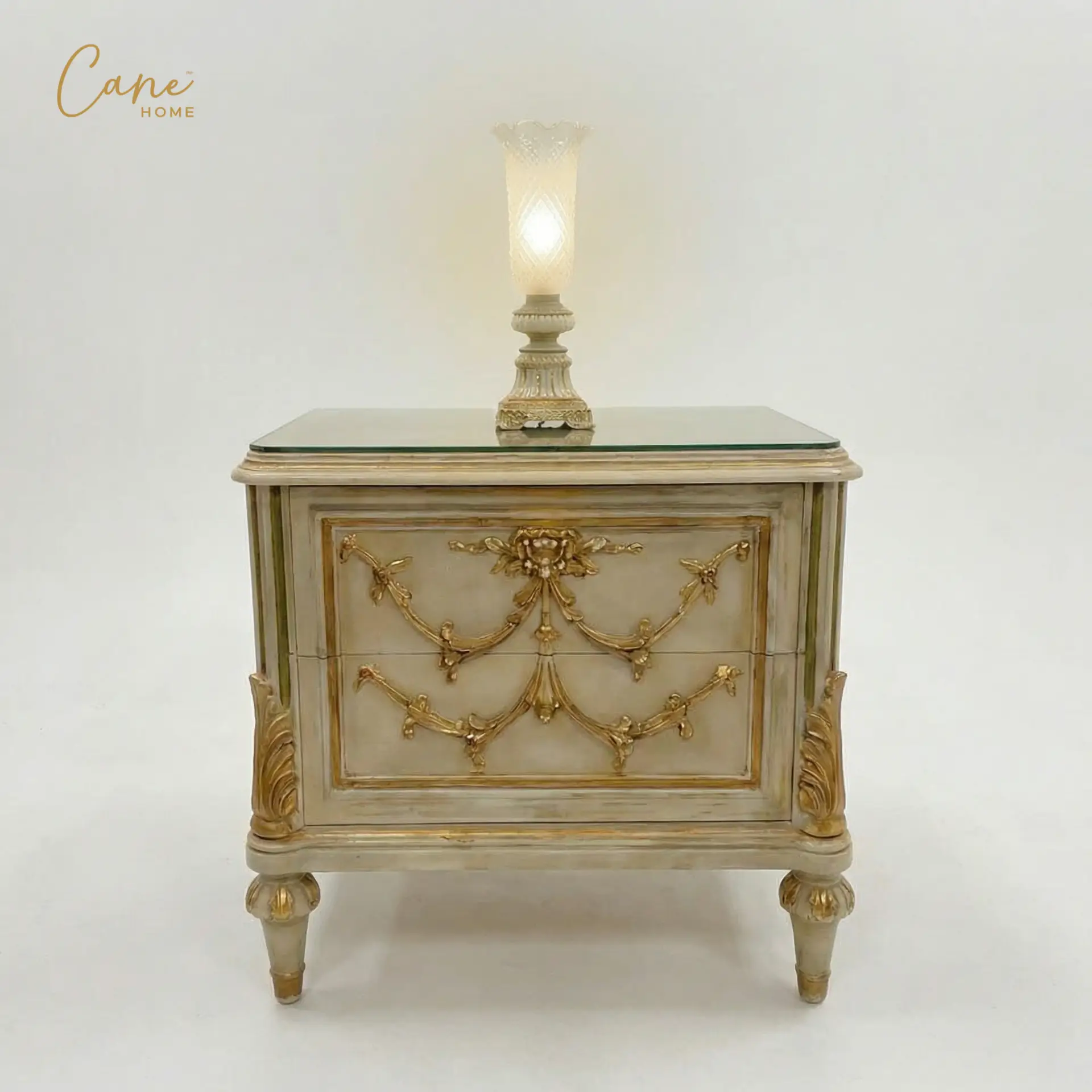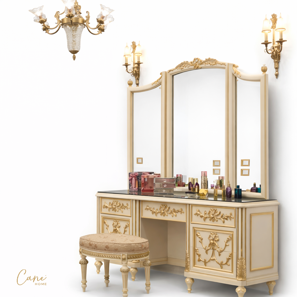 حوّل غرفة نومك إلى ملاذ من الرفاهية والأناقة مع غرفة النوم الكلاسيكي المستوحى من فنون العصر الذهبي. يبرز السرير بظهره العالي المنجد المريح المصنوع من الخشب الزان الطبيعي المحفور يدويا ببراعة مذهلة المدهون بدرجة الأوف وايت المطعم بالذهب المعتق، وتتكون هذه الغرفة من سرير و (2) كوميدينو وتسريحة بالمرايا بالاضافة الي الكرسي مع وحدة ادراج .