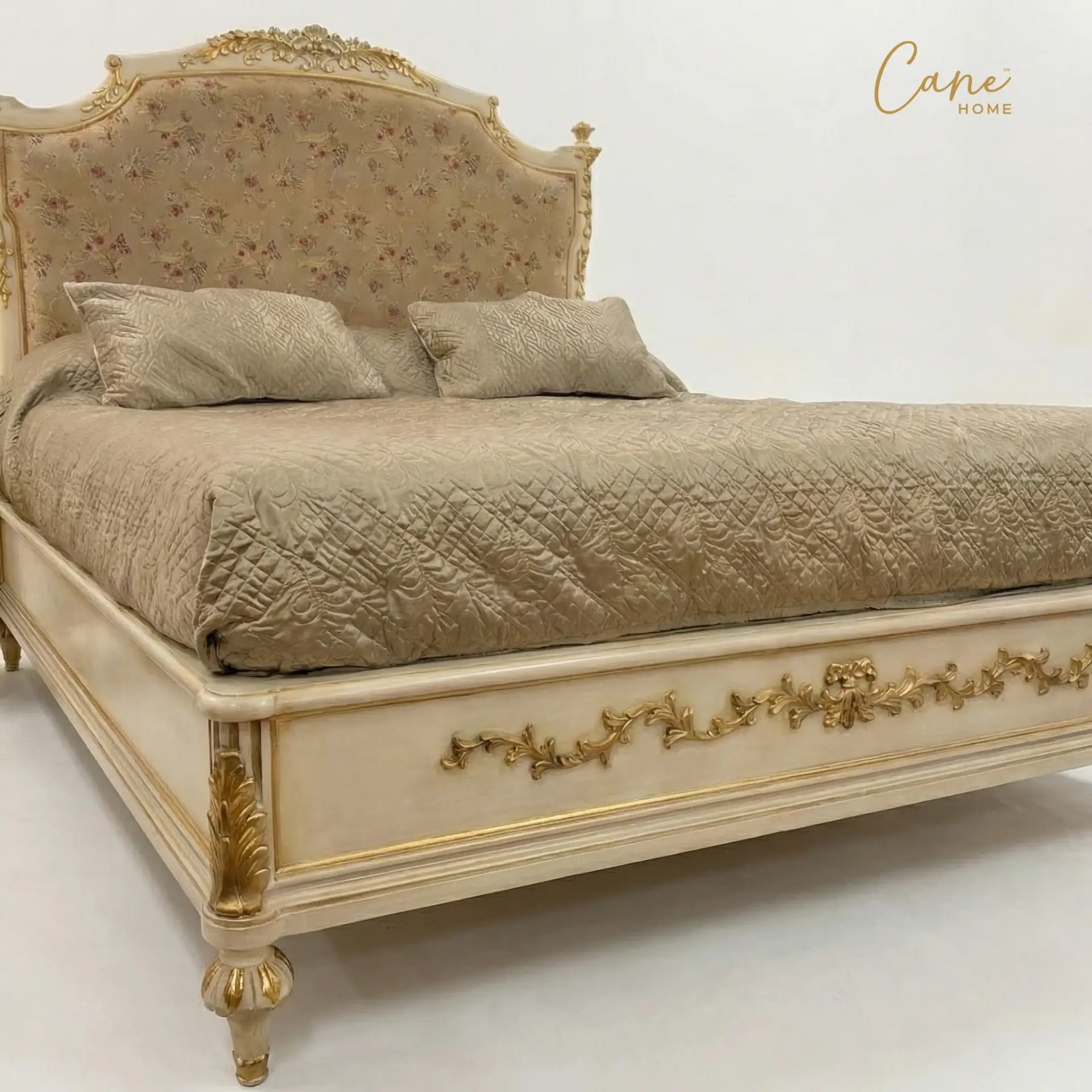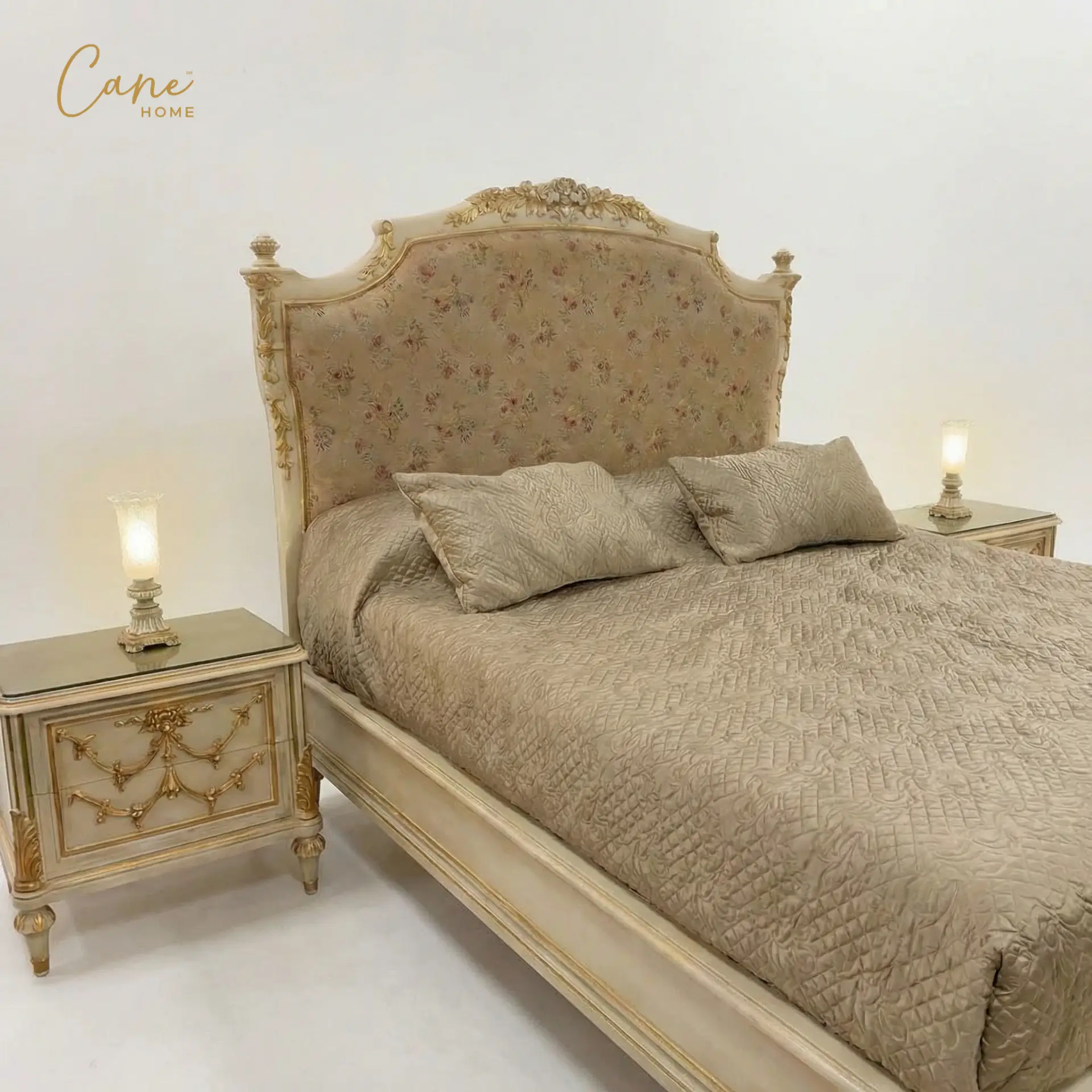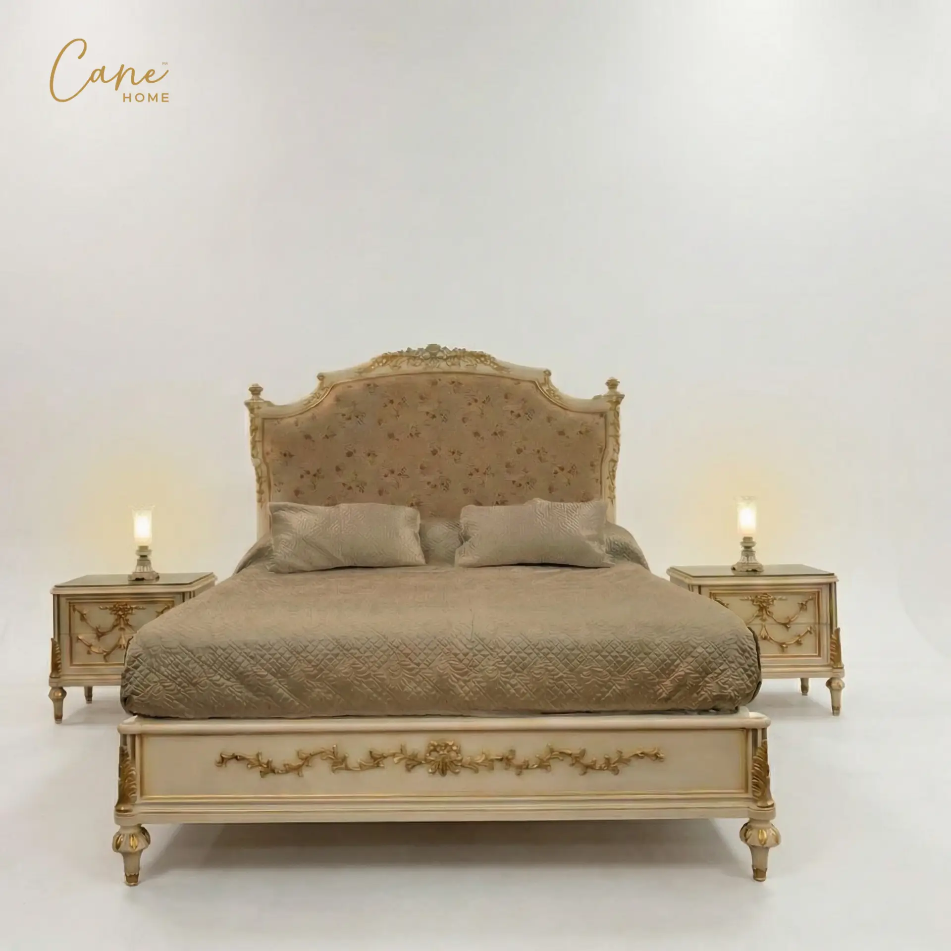 غرفة نوم “رينيسانس” ملكي – سرير فاخر مع طاولات جانبية (كمودينو) بنقوش ذهبية.