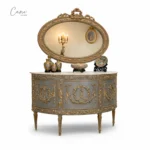مدخل بيضاوي ملكي خشب زان – محفور يدوياً بطلاء رمادي ذهبي وسطح رخامي