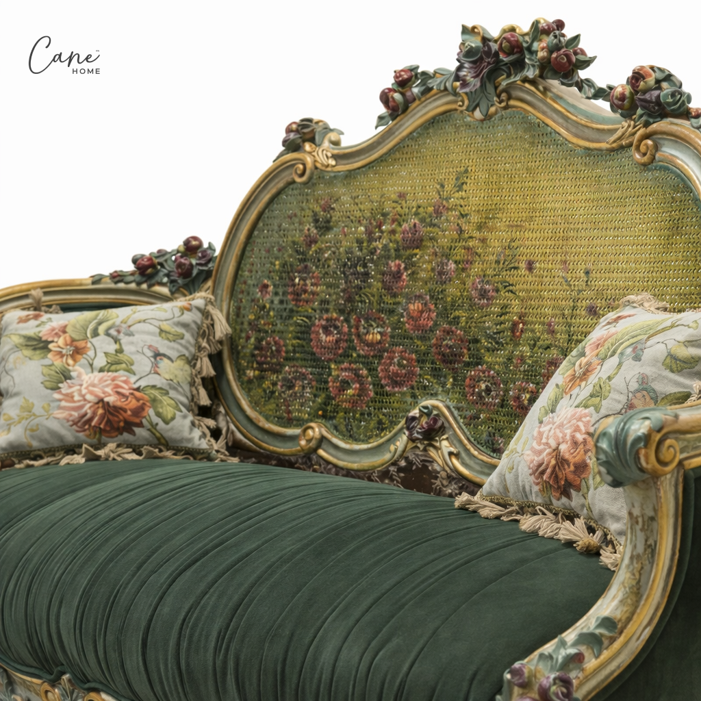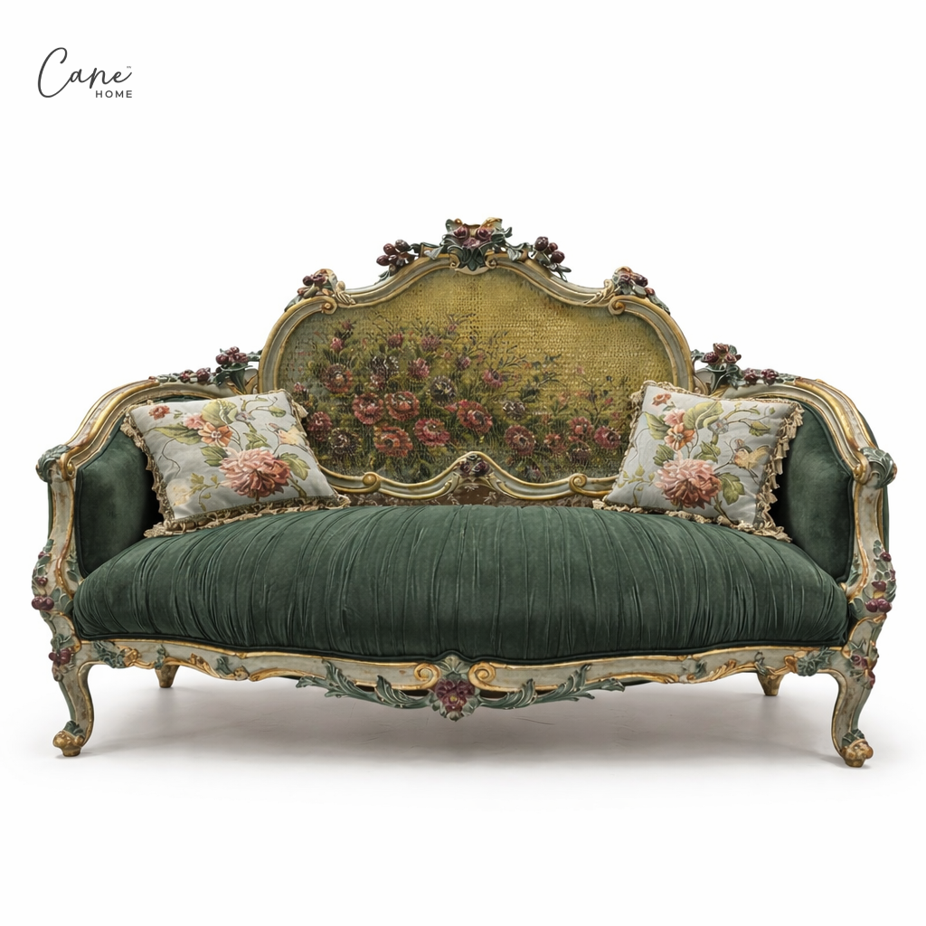تُعد هذه الكنبة الكلاسيكية تحفة فنية نادرة، حيث تمزج بين فخامة المقاعد المخملية وسحر اللوحات الزيتية الكلاسيكية. تتميز الكنبة بمسند ظهر مرتفع يزدان بـالكانيه الطبيعي المرسوم يدويا بألوان دافئة، مما يمنحها طابعاً متحفياً فريداً مع الفريم الخشبي المصنوع من الخشب الزان الطبيعي المحفور يدويا المدهون بالألوان الريفية مع عدد (2) كوشنز مطرزين.