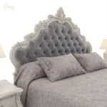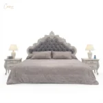 طقم غرفة نوم “فيولا” الملكي – سرير كابتونيه رمادي مخملي مع 2 كومودينو بنحت يدوي كلاسيكي مع (1) تسريحة بالمرايا بالاضافة للرسم اليدوي .