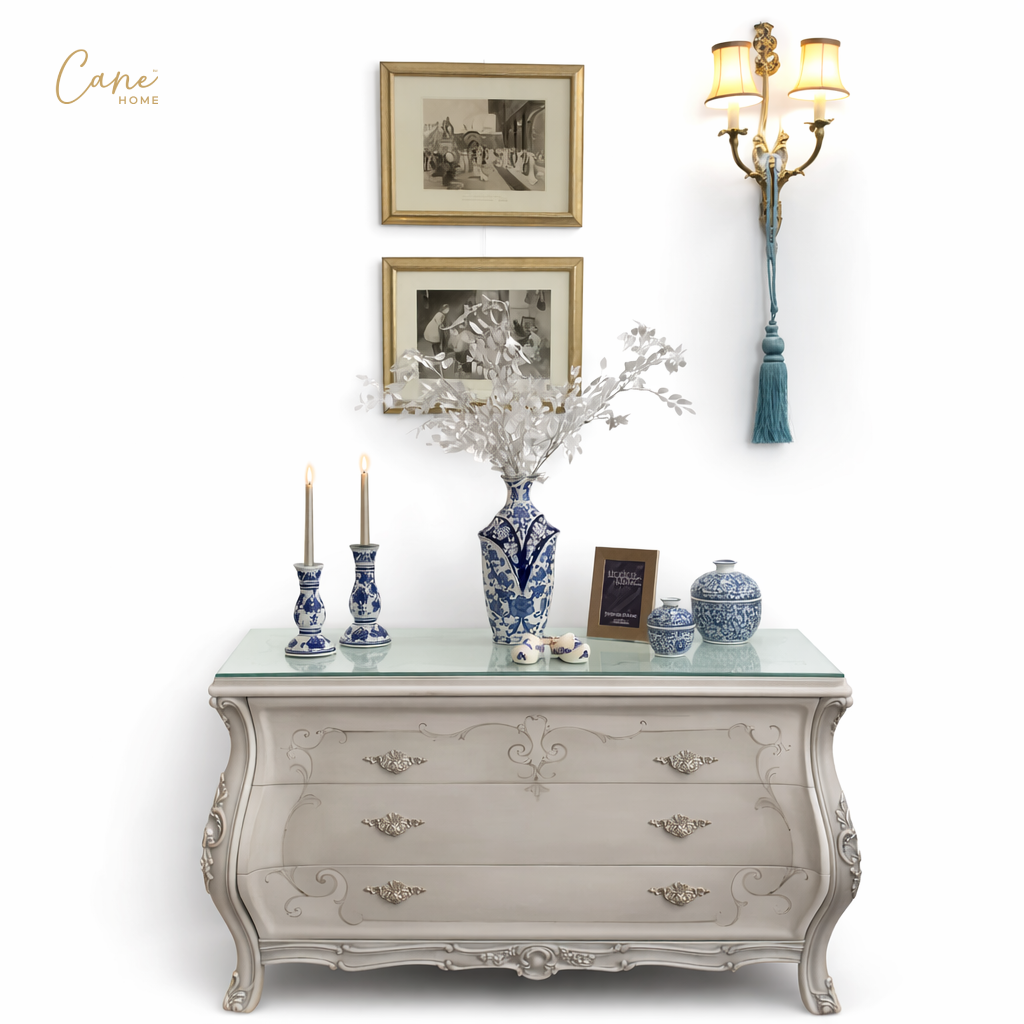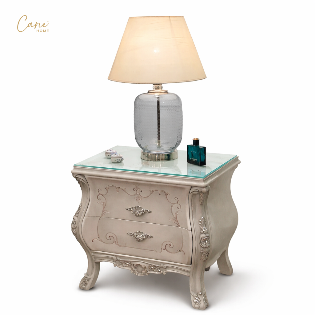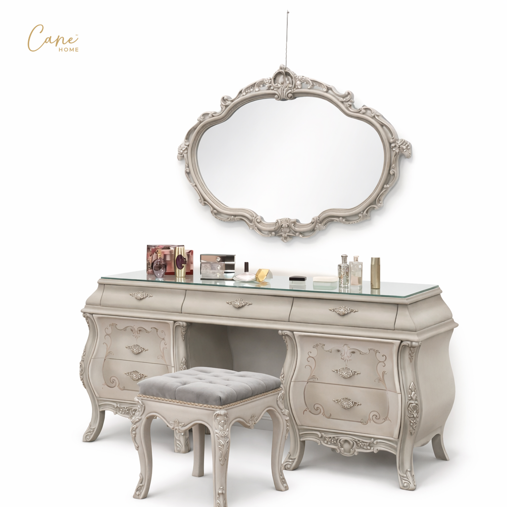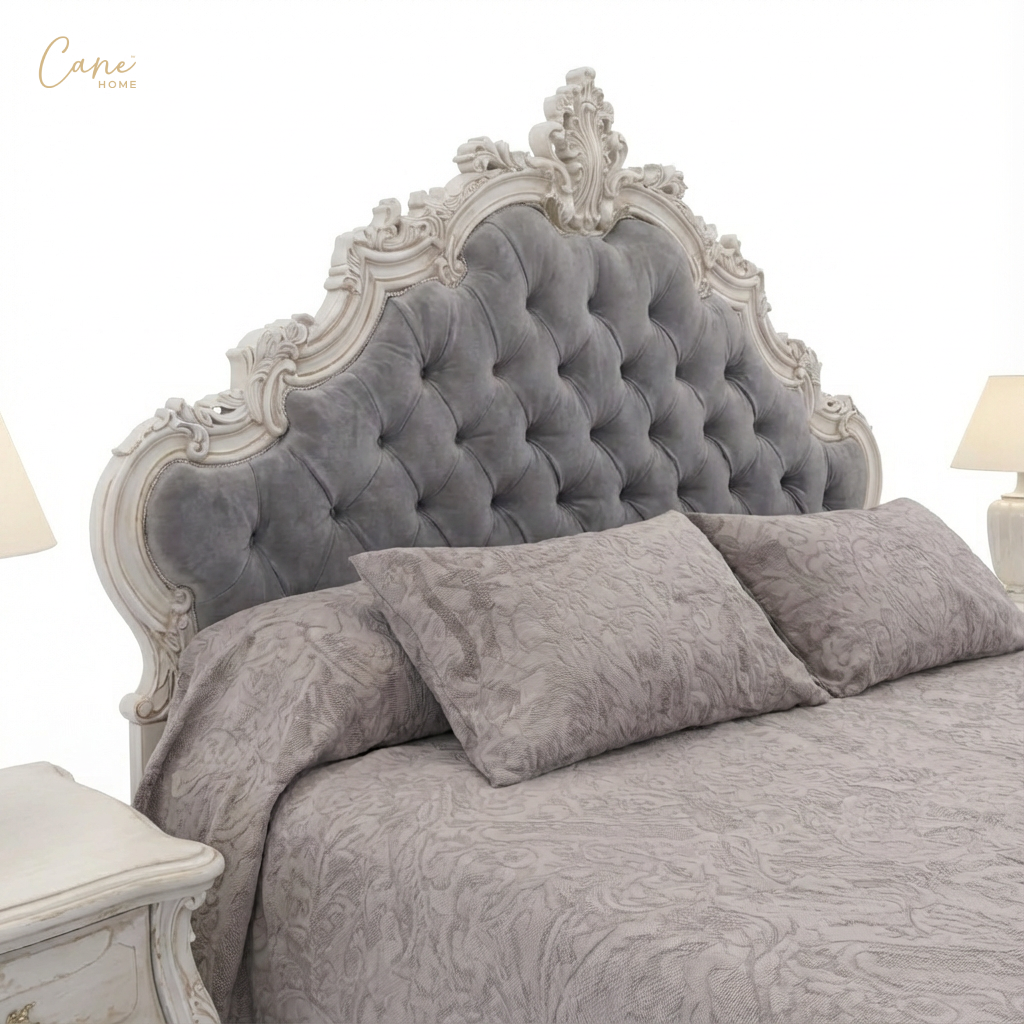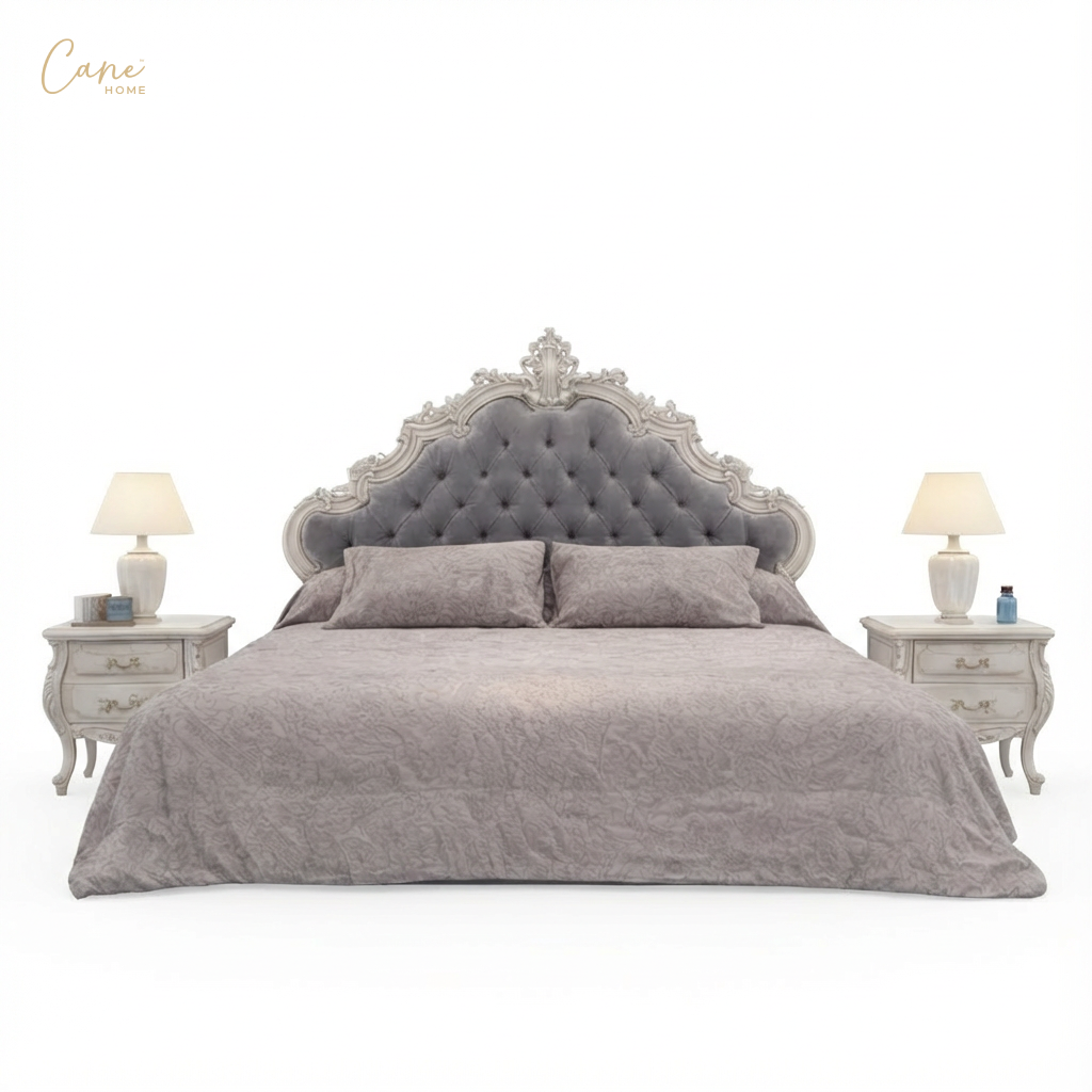 حوّل غرفة نومك إلى جناح ملكي يجمع بين سحر الماضي ورفاهية الحاضر مع غرفة النوم الكلاسيكي الفاخر. يبرز السرير كقطعة مركزية تخطف الأنظار بظهره العالي (Headboard) المنجد بأسلوب “الكابتونيه” المتقن باستخدام مخمل رمادي فاخر، ومصنوع هذا السرير من الخشب الزان الطبيعي المطعم بالحفر اليدوي الذي يعكس الفخامة الفرنسية وتتكون هذه الغرفة من سرير و  2 كومود مع تسريحة بالمرايا بالاضافة الي كرسي مع وحدة ادراج المطعمة بالرسم اليدوي .