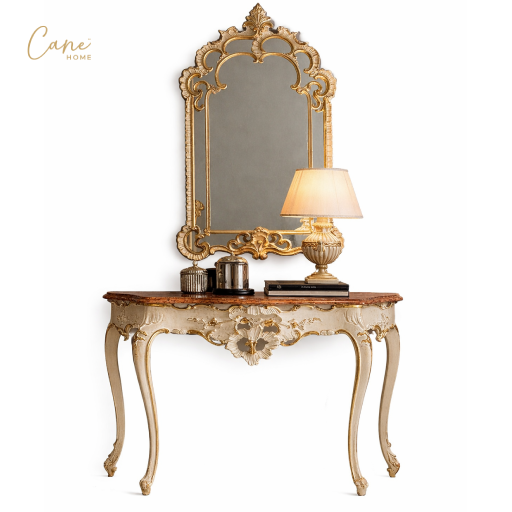 • الكونسول الملكي: يتميز بتصميم منحني وأرجل رشيقة محفورة بدقة، مطلية باللون الكريمي الهادئ مع تطعيمات بـ ورق الذهب المعتق.